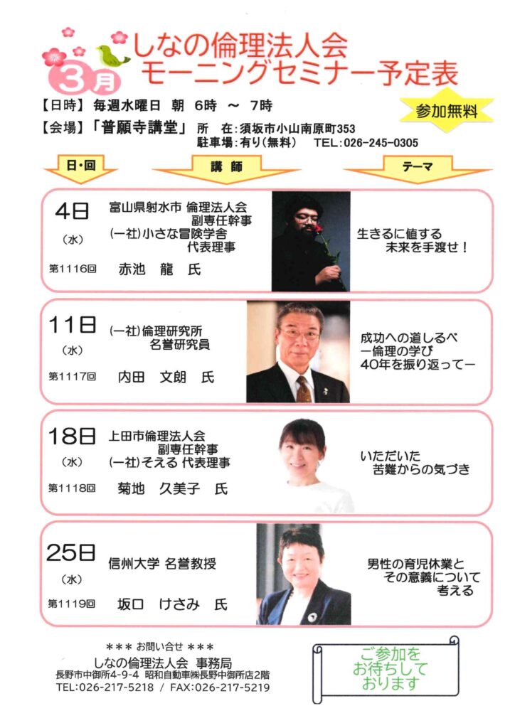 2026年 2/1 月間曜日水曜日 月間予定表しなの倫理法人会 モーニングセミナー 6:00~7:00 (しなの)しなの倫理法人会モーニングセミナー 2月月間予定表 会場 普願寺講堂 主催 しなの倫理法人会