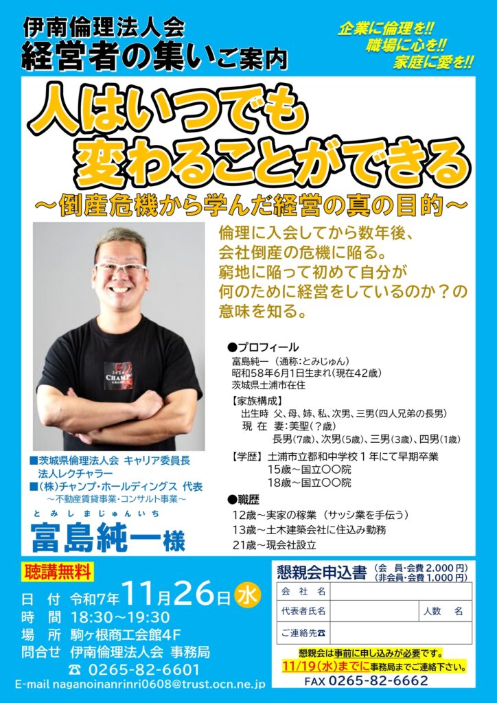 2025年 11/26 水曜日 伊南倫理法人会 ナイトセミナー・経営者の集い 参加費: 参加費無料:懇親会費別途 18:30~19:30 (伊南)経営者の集い「人はいつでも変わることができる」~倒産危機から学んだ経営の真の目的~ (株)チャンプ・ホールディングス 代表 茨城県倫理法人会 キャリア委員長 法人レクチャラー 富島純一氏 セミナー参加申込 会場 駒ヶ根商工会館 4F 中会議室 主催 伊南倫理法人会