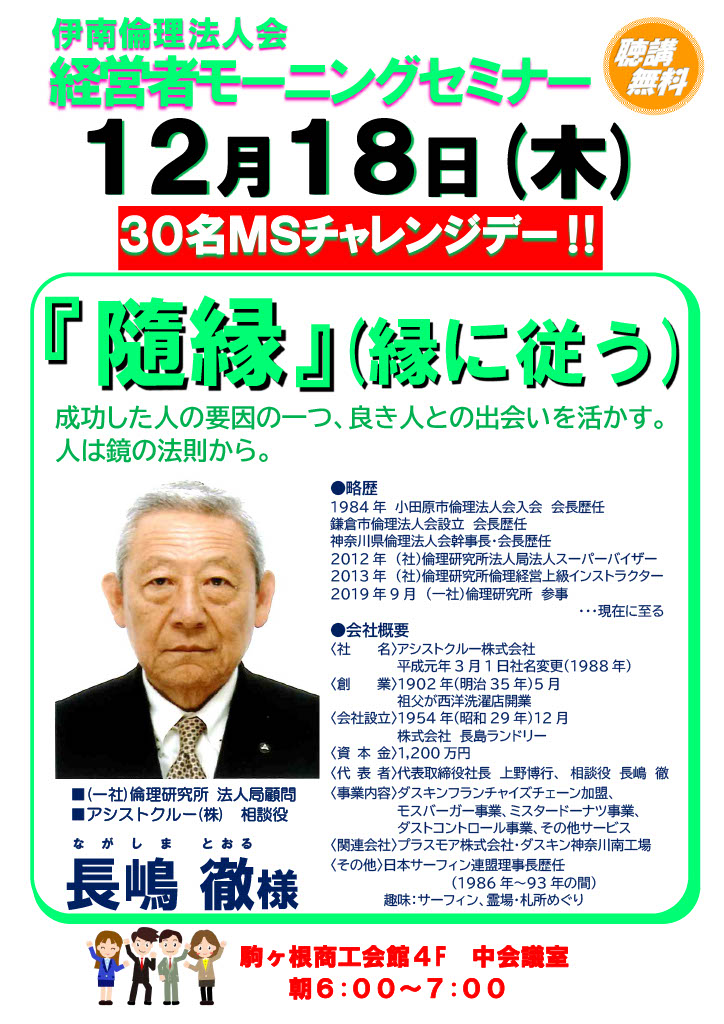 2025年 12/18 木曜日 伊南倫理法人会 モーニングセミナー 参加費: 無料、朝食ドーナツ無料 6:00~7:00AM (伊南)30名MS【『隨縁』(縁に従う)】 アシスルトクルー(株) 相談役 (一社)倫理研究所 法人局顧問 長嶋 徹氏 セミナー参加申込 会場 駒ヶ根商工会館 4F 中会議室 主催 伊南倫理法人会