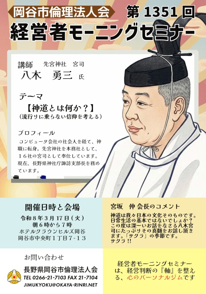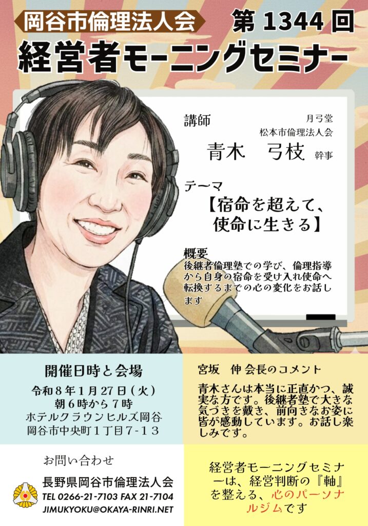 2026年 1/27 火曜日 諏訪地区岡谷市倫理法人会 モーニングセミナー 参加費: 参加費無料:朝食代別途(300円) 6:00~7:00AM (岡谷市)「宿命を超えて、使命に生きる」 月弓堂 松本市倫理法人会 幹事 青木 弓枝氏 講話要旨後継者倫理塾での学び、倫理指導から自身の宿命を受け入れ使命へ転換するまでの心の変化をお話します セミナー参加申込 会場 ホテルクラウンヒルズ岡谷 主催 岡谷市倫理法人会