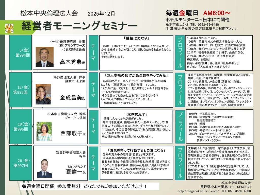 2025年 12/1 金曜日 月間予定表松本中央倫理法人会 モーニングセミナー 参加費: 参加費無料:朝食代別途(800円) 6:00~7:00AM (松本中央)12月モーニングセミナー月間予定表 講話内容講師プロフィール セミナー参加申込 会場 ホテルモンターニュ松本 主催 松本中央倫理法人会