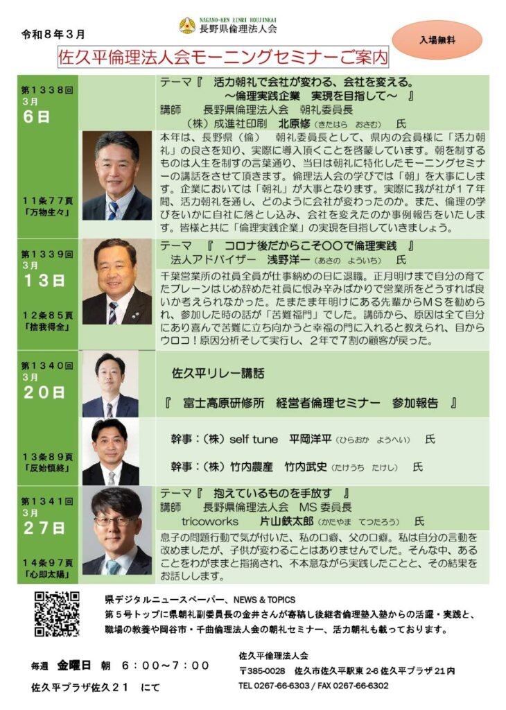 2026年 3/10 月間曜日 佐久平倫理法人会 モーニングセミナー 参加費: 無料 朝食代別途500円 6:00~7:00 佐久平3月モーニングセミナー 【毎週金曜日】 3月6日、13日、20日、27日 会場 佐久平プラザ21 主催 佐久平倫理法人会