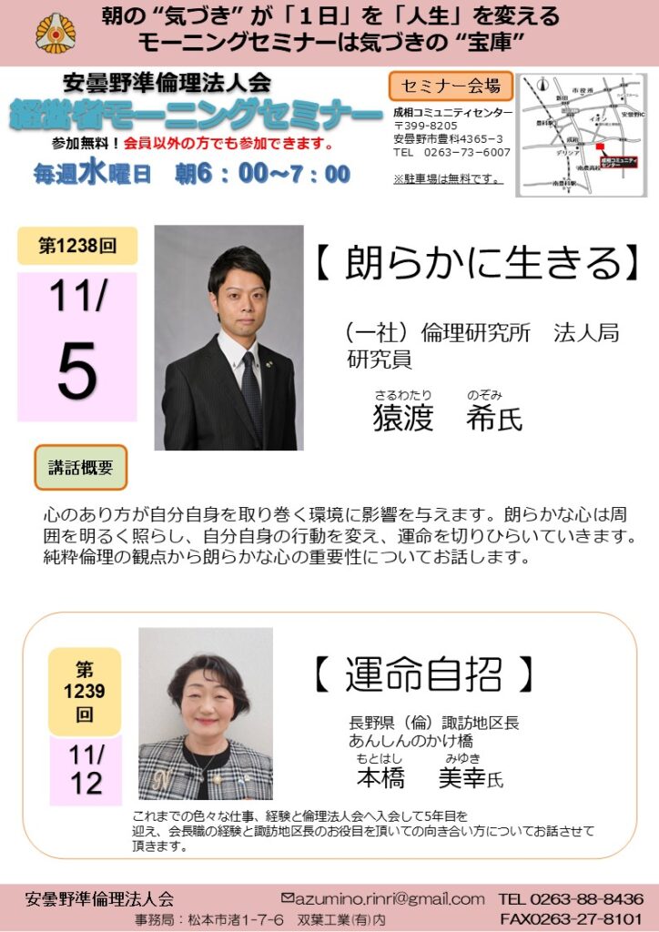 2025年 11/5 水曜日 中信地区安曇野準倫理法人会 モーニングセミナー 参加費: 無料(朝食代別途300円) 6:00~7:00AM (安曇野準)モーニングセミナー【朗らかに生きる】 (一社)倫理研究所 法人局 研究員 猿渡 希氏 会場 成相コミュニティセンター 主催 安曇野準倫理法人会