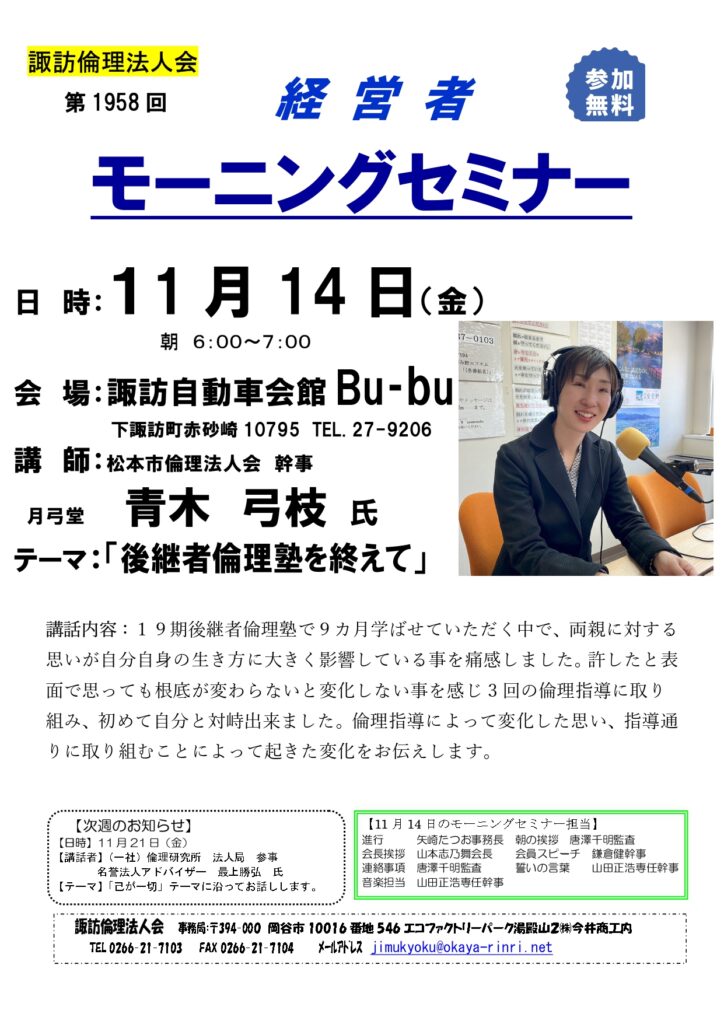 | 講話要旨 19期後継者倫理塾で9カ月学ばせていただく中で、両親に対する思いが自分自身の生き方に 大きく影響している事を痛感しました。許したと表面で思っても根底が変わらないと変化しない事を 感じ3回の倫理指導に取り組み、初めて自分と対峙出来ました。倫理指導によって変化した思い 指導通りに取り組むことによって起きた変化をお伝えします。 |