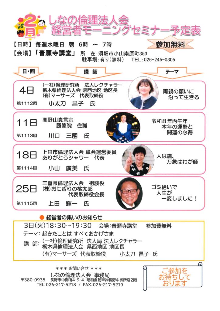 2026年 2/1 月間曜日水曜日 月間予定表しなの倫理法人会 モーニングセミナー 6:00~7:00 (しなの)しなの倫理法人会モーニングセミナー 2月月間予定表 会場 普願寺講堂 主催 しなの倫理法人会