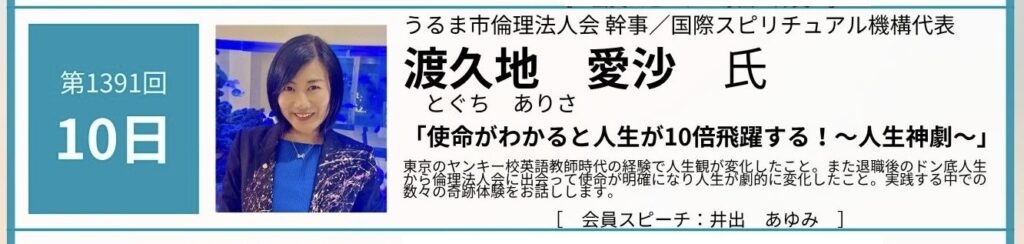 | 講師プロフィール | 渡久地 愛沙 氏 (うるま市倫理法人会 幹事/国際スピリチュアル機構 代表) |
