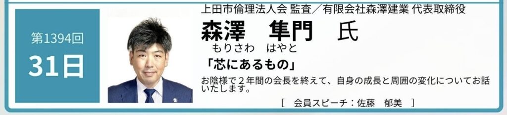 | 講師プロフィール | 森澤 隼門 氏 (上田市倫理法人会 監査/(有)森澤建業 代表取締役) |