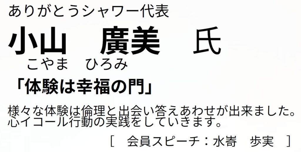 | 講話内容 | 様々な体験は倫理と出会い答えあわせが出来ました。心イコール行動の実践をしていきます。 |