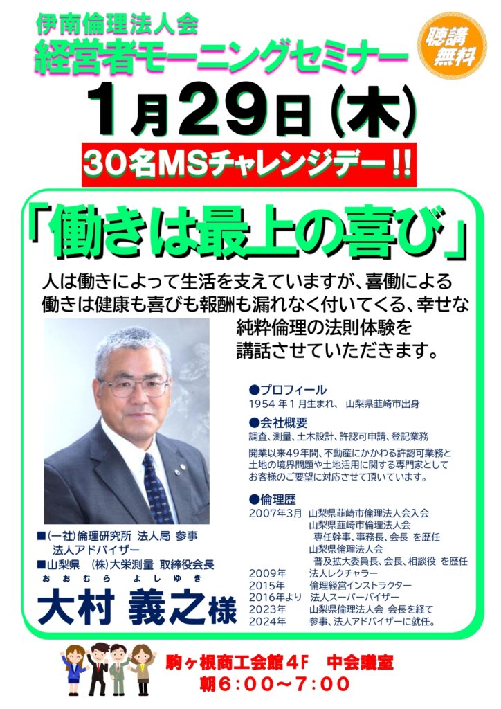 | ●講師プロフィール 1954年1月生まれ、 山梨県韮崎市出身 ●会社概要 調査、測量、土木設計、許認可申請、登記業務 開業以来49年間、不動産にかかわる許認可業務と 土地の境界問題や土地活用に関する専門家として お客様のご要望に対応させて頂いています。 ●倫理歴 2007年3月 山梨県韮崎市倫理法人会入会 山梨県韮崎市倫理法人会 専任幹事、事務長、会長 山梨県倫理法人会 普及拡大委員長、会長、相談役 を歴任。 2009年 法人レクチャラー 2015年 倫理経営インストラクター 2016年より 法人スーパーバイザー 2023年 山梨県倫理法人会 会長を経て 2024年 参事、法人アドバイザーに就任。 |