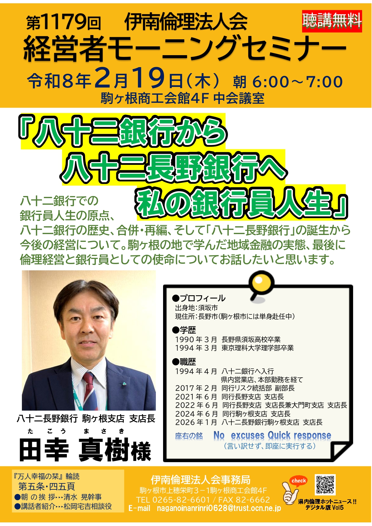2026年 2/19 木曜日 伊南倫理法人会 モーニングセミナー 参加費: 無料、朝食:別途集金(400円) 6:00~7:00AM (伊南)【八十二銀行から八十二長野銀行へ私の銀行員人生】 八十二長野銀行 駒ヶ根支店 支店長 田幸 真樹氏 セミナー参加申込 会場 駒ヶ根商工会館 4F 中会議室 主催 伊南倫理法人会