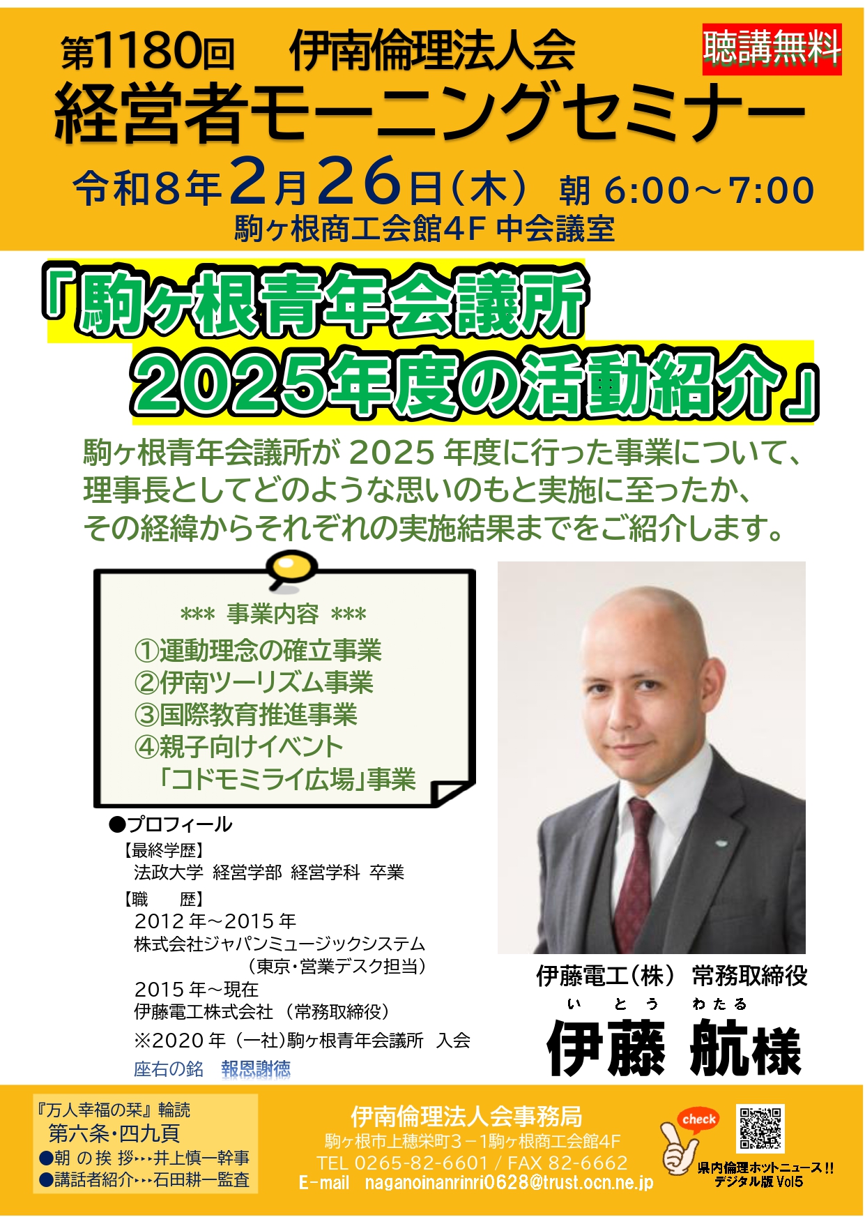 2026年 2/26 木曜日 伊南倫理法人会 モーニングセミナー 参加費: 無料、朝食:別途集金(400円) 6:00~7:00AM (伊南)【駒ヶ根商工会議所2025年度の活動紹介】 伊藤電工(株) 常務取締役 伊藤 航氏 セミナー参加申込 会場 駒ヶ根商工会館 4F 中会議室 主催 伊南倫理法人会