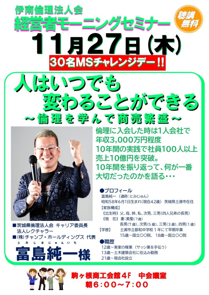 2025年 11/27 木曜日 伊南倫理法人会 モーニングセミナー 参加費: 参加費無料:朝食ドーナツ無料 6:00~7:00AM (伊南)30名MS【人はいつでも変わることができる~倫理を学んで商売繁盛~】 (株)チャンプ・ホールディングス 代表 茨城県倫理法人会 キャリア委員長 法人レクチャラー 富島純一氏 セミナー参加申込 会場 駒ヶ根商工会館 4F 中会議室 主催 伊南倫理法人会