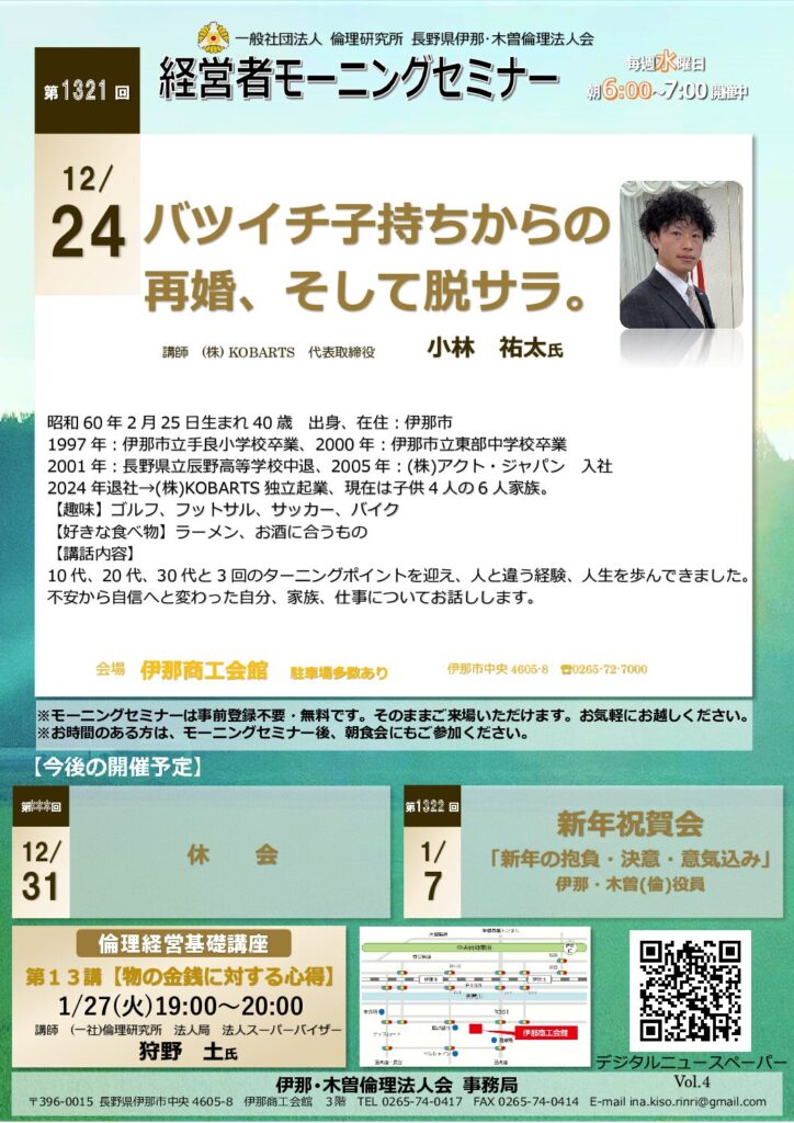 2025年 12/24 水曜日 伊那・木曽倫理法人会 モーニングセミナー 参加費: 参費無料:朝食無料 6:00~7:00AM (伊那・木曽)バツイチ子持ちからの再婚、そして脱サラ。 (株)KOBARTS 代表取締役 小林 祐太氏 セミナー参加申込 会場 伊那商工会議所 大ホール 主催 伊那・木曽倫理法人会