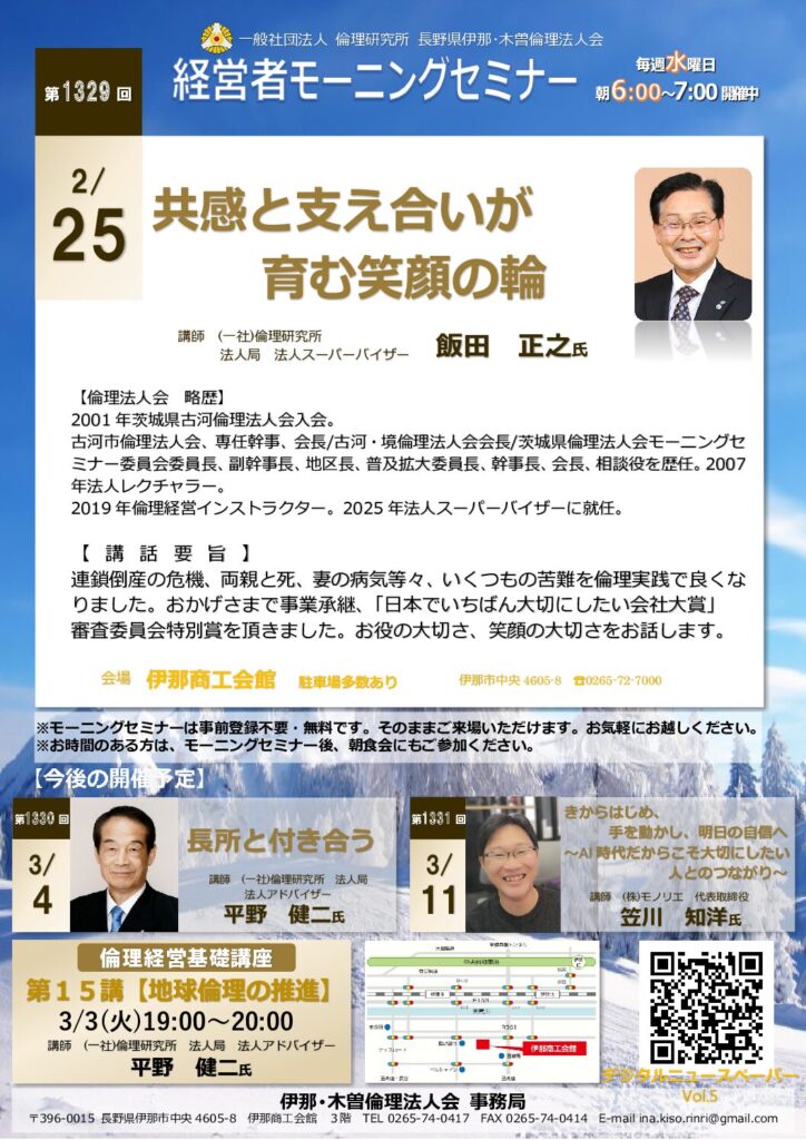 2026年 2/25 水曜日 伊那・木曽倫理法人会 モーニングセミナー 参加費: 参費無料:朝食無料 6:00~7:00AM (伊那・木曽)共感と支え合いが育む笑顔の輪 (一社)倫理研究所 法人局 法人スーパーバイザー 飯田 正之氏 セミナー参加申込 会場 伊那商工会議所 大ホール 主催 伊那・木曽倫理法人会