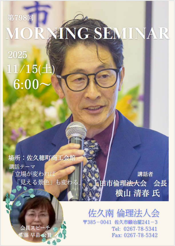 2025年 11/15 土曜日 佐久南倫理法人会 モーニングセミナー 参加費: 参加費無料 6:00~7:00AM (佐久南)モーニングセミナー ~立場が変われば「見える景色」も変わる~ 講話内容立場が変われば「見える景色」も変わる セミナー終了後朝食会を開催しております。事前予約制です。申込締切は木曜日です。朝食代800円今週の朝ごはんはタミーベーカリーのパンセットです 朝食のお申し込みはこちら セミナー参加申込 会場 佐久穂商工会館2F 主催 佐久南倫理法人会