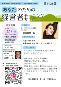 2026年 2/19 木曜日 千曲倫理法人会 モーニングセミナー 参加費: モーニングセミナー無料 6時~7時 朝食:屋代駅前のMaゐCafe(マイカフェ)さんのおにぎりセット¥500 7時~7時半 (千曲)モーニングセミナー ライフデザイン×予防医学アドバイザー 柴田真実氏 会場 千曲商工会議所 主催 千曲倫理法人会 https://maps.app.goo.gl/immFncfDMc32sAk59