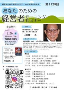 2026年 2/26 木曜日 千曲倫理法人会 モーニングセミナー 参加費: モーニングセミナー無料 6時~7時 朝食:屋代駅前のMaゐCafe(マイカフェ)さんのおにぎりセット¥500 7時~7時半 (千曲)モーニングセミナー (株)おにぎりの桃太郎 会長 三重県倫理法人会 相談役 上田輝一氏 会場 千曲商工会議所 主催 千曲倫理法人会 https://maps.app.goo.gl/immFncfDMc32sAk59