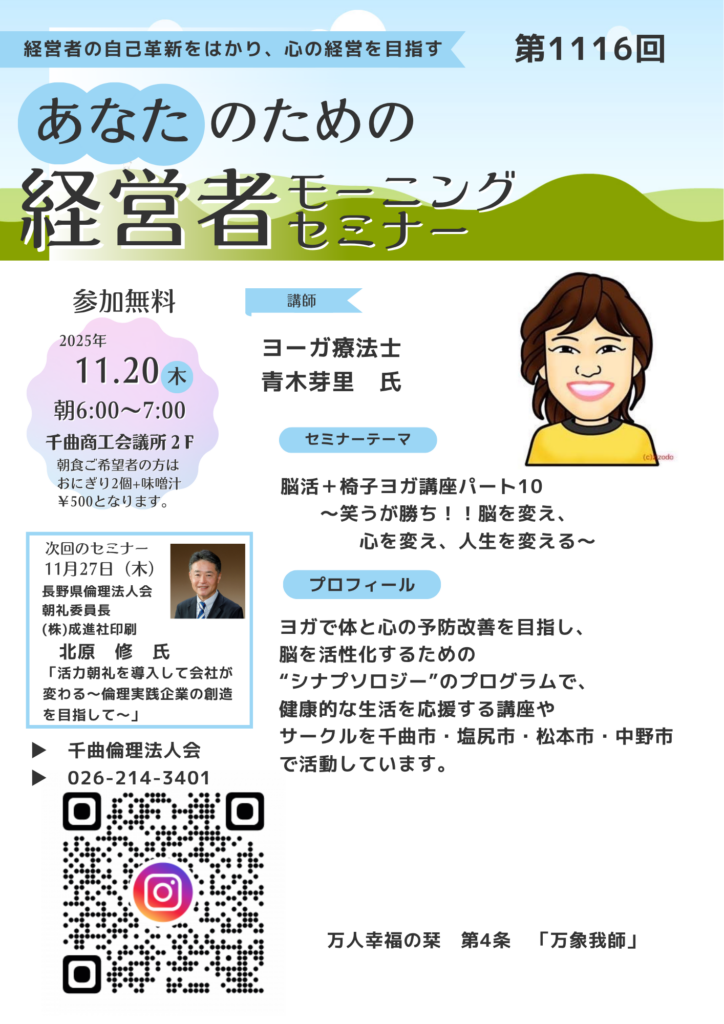 2025年 11/20 木曜日 千曲倫理法人会 モーニングセミナー 参加費: モーニングセミナー無料 6時~7時 朝食:屋代駅前のMaゐCafe(マイカフェ)さんのおにぎりセット¥500 7時~7時半 (千曲)モーニングセミナー 青木芽里氏 会場 千曲商工会議所 主催 千曲倫理法人会 https://maps.app.goo.gl/immFncfDMc32sAk59