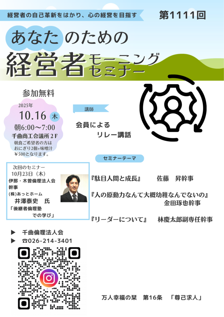 2025年 10/13 木曜日 千曲倫理法人会 モーニングセミナー 参加費: モーニングセミナー無料 6時~7時 朝食:屋代駅前のMaゐCafe(マイカフェ)さんのおにぎりセット¥500 7時~7時半 (千曲)モーニングセミナー 佐藤 昇 ほか氏 会場 千曲商工会議所 主催 千曲倫理法人会 https://maps.app.goo.gl/immFncfDMc32sAk59