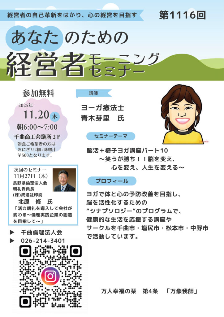2025年 11/20 木曜日 千曲倫理法人会 モーニングセミナー 参加費: モーニングセミナー無料 6時~7時 朝食:屋代駅前のMaゐCafe(マイカフェ)さんのおにぎりセット¥500 7時~7時半 (千曲)モーニングセミナー ヨーガ療法士 青木芽里氏 会場 千曲商工会議所 主催 千曲倫理法人会 https://maps.app.goo.gl/immFncfDMc32sAk59