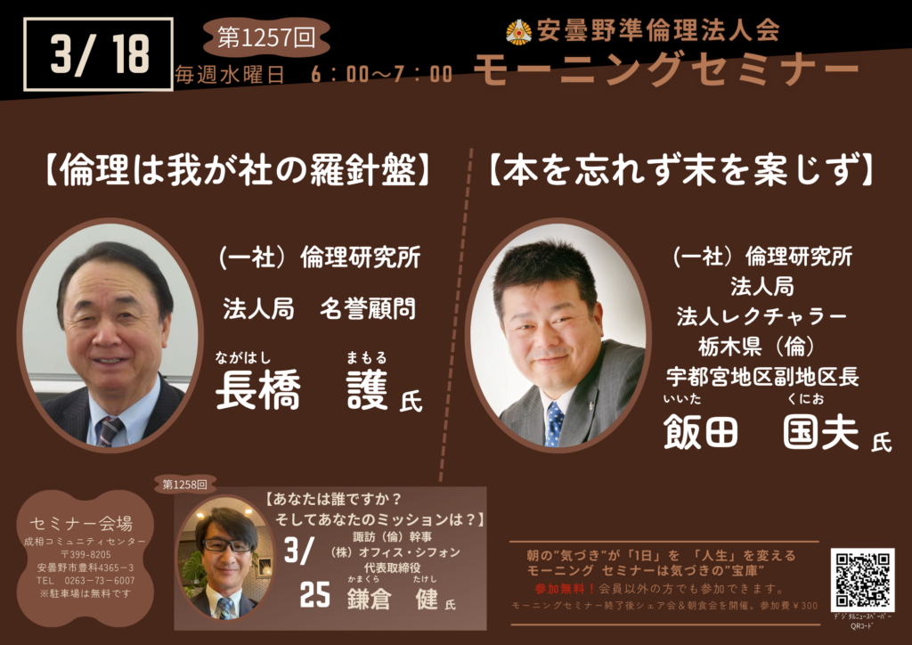 2026年 3/18 水曜日 安曇野準倫理法人会 モーニングセミナー 参加費: 参加費無料(朝食代300円) 6:00~7:00 (安曇野準)モーニングセミナー「倫理は我が社の羅針盤」「本を忘れず末を案じず」 名誉顧問 長橋 護氏/法人レクチャラー 飯田 国夫氏 会場 成相コミュニティセンター 主催 安曇野準倫理法人会