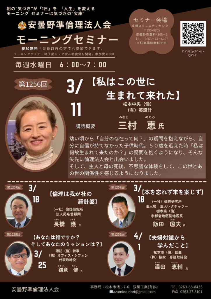 2026年 3/11 水曜日 安曇野準倫理法人会 モーニングセミナー 参加費: 参加費無料(朝食代300円) 6:00~7:00 (安曇野準)モーニングセミナー「私はこの世に生まれて来れた」 松本中央(倫)三村 恵 会場 成相コミュニティセンター 主催 安曇野準倫理法人会