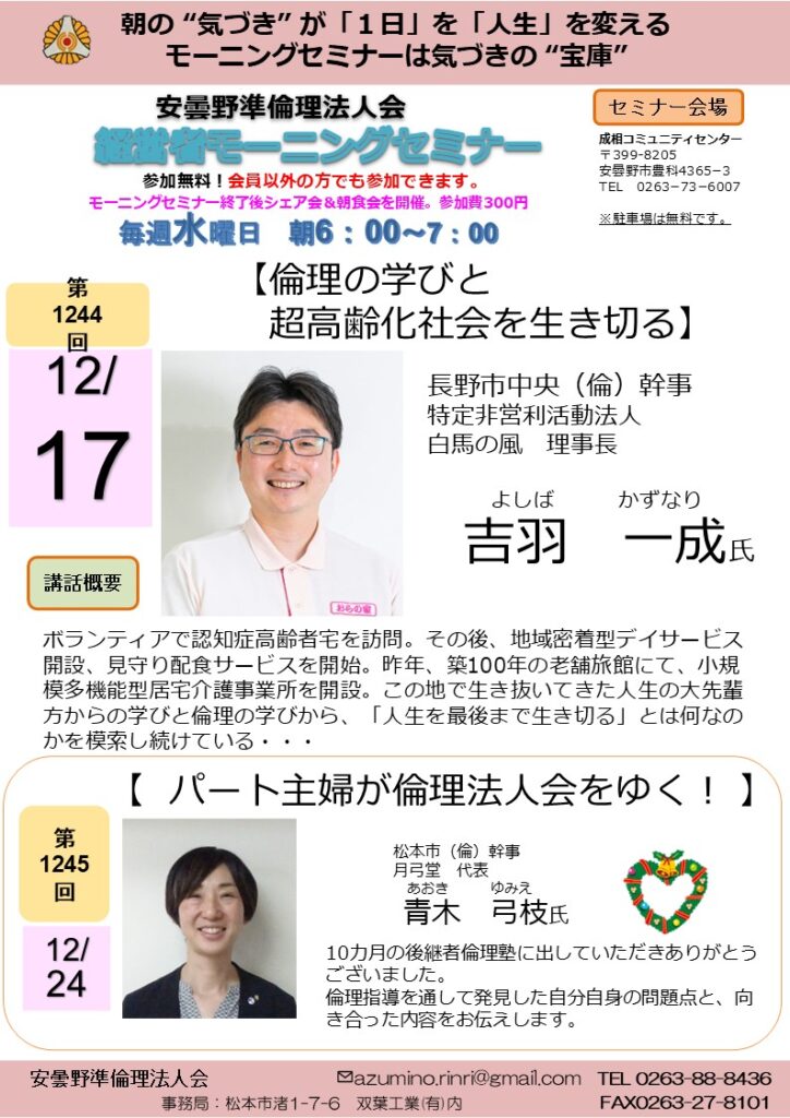 2025年 12/17 水曜日 中信地区安曇野準倫理法人会 モーニングセミナー 参加費: 参加費無料(朝食代別途300円) 6:00~7:00 (安曇野準)モーニングセミナー【倫理と学びと超高齢化社会を生き切る】 特定非営利活動法人 白馬の風 理事長 長野市(倫)幹事 吉羽 一成氏 会場 成相コミュニティーセンター 主催 安曇野準倫理法人会