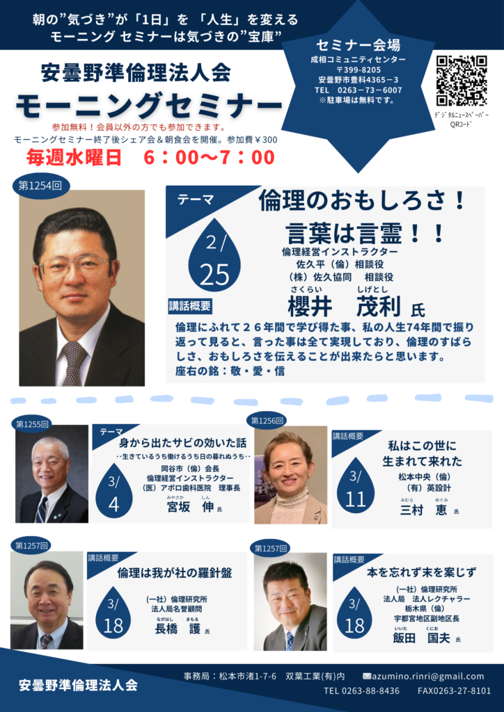 2026年 2/25 水曜日 中信地区安曇野準倫理法人会 モーニングセミナー 参加費: 無料(朝食代300円) 6:00~7:00 (安曇野準)モーニングセミナー【倫理のおもしろさ!言葉は言霊!!】 (株)佐久協同 相談役 倫理経営インストラクター 佐久平(倫)相談役 櫻井 茂利氏 会場 成相コミュニティセンター 主催 安曇野準倫理法人会