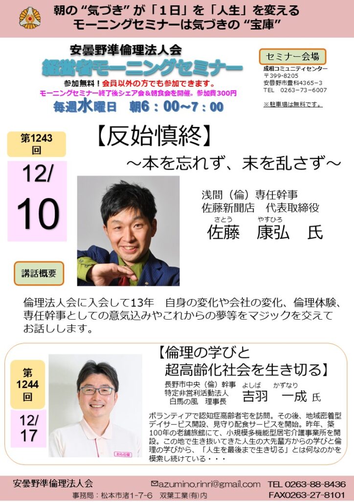2025年 12/10 水曜日 中信地区安曇野準倫理法人会 モーニングセミナー 参加費: 参加費無料(朝食代別途300円) 6:00~7:00 (安曇野準)モーニングセミナー【反始慎終】 佐藤新聞店 代表取締役 浅間(倫)専任幹事 佐藤 康弘氏 会場 成相コミュニティーセンター 主催 安曇野準倫理法人会
