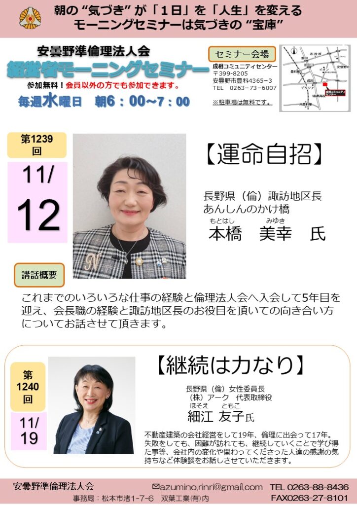 2025年 11/12 水曜日 中信地区安曇野準倫理法人会 モーニングセミナー 参加費: 無料(朝食代別途300円」) 6:00~7:00AM (安曇野準)モーニングセミナー【運命自招】 あんしんのかけ橋 代表 長野県(倫)諏訪地区長 本橋 美幸氏 会場 成相コミュニティセンター 主催 安曇野準倫理法人会