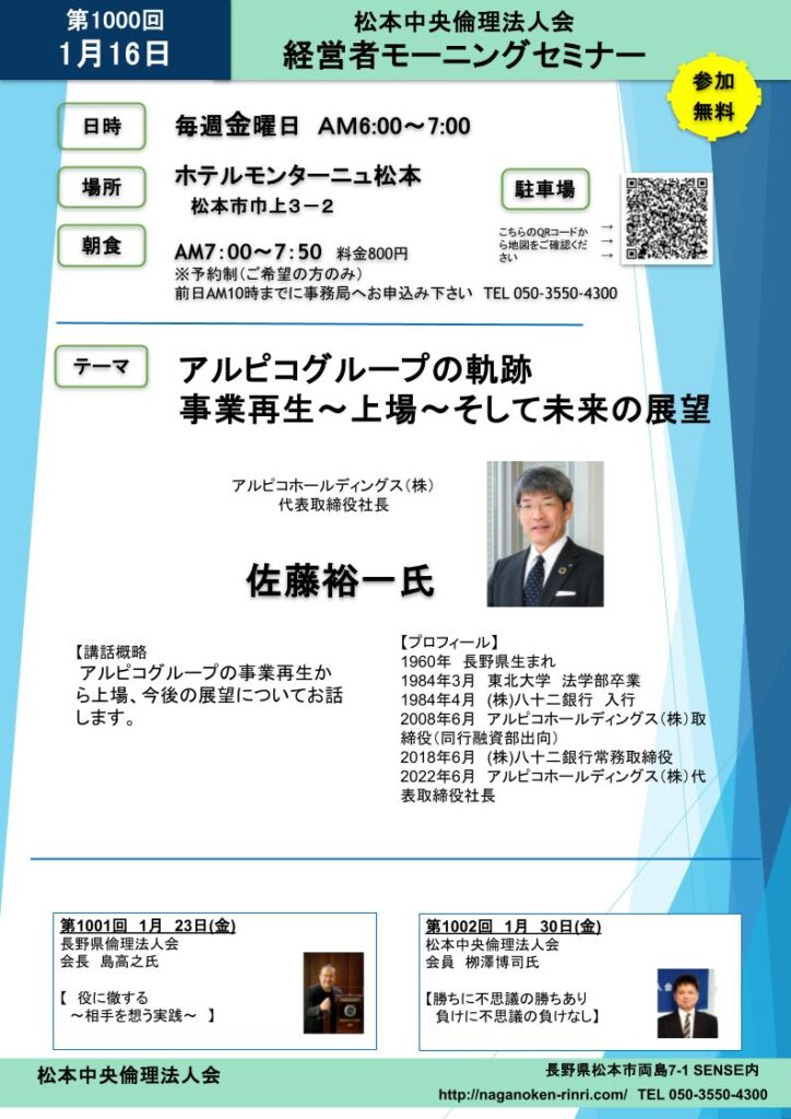 | 講師プロフィール | 1960年 長野県生まれ 1984年3月 東北大学 法学部卒業 1984年4月 (株)八十二銀行 入行 2008年6月 アルピコホールディングス(株)取締役(同行融資部出向) 2018年6月 (株)八十二銀行常務取締役 2022年6月 アルピコホールディングス(株)代表取締役社長 |