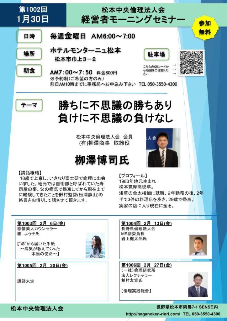 (松本中央)モーニングセミナー「勝ちに不思議の勝ちあり、負けに不思議の負けなし」