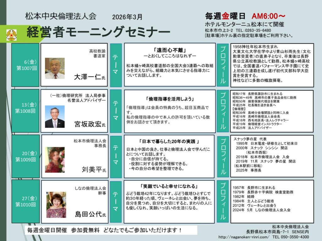 2026年 3/1 金曜日 月間予定表松本中央倫理法人会 モーニングセミナー 参加費: 参加費無料:朝食代別途(800円) 6:00~7:00AM (松本中央)3月モーニングセミナー月間予定表 講話内容講師プロフィール セミナー参加申込 会場 ホテルモンターニュ松本 主催 松本中央倫理法人会