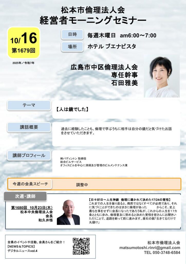 2025年 10/16 木曜日 松本市倫理法人会 モーニングセミナー 参加費: 参加費無料(朝食代:別途1,500円) 6:00〜7:00 (松本市)モーニングセミナー 【人は鏡でした】 ㈱パディントン 取締役 広島市中区倫理法人会 専任幹事 石田雅美氏 セミナー参加申込 会場 ホテルブエナビスタ 主催 松本市倫理法人会 https://maps.app.goo.gl/KKFXWNXbyzZKcY9ZA