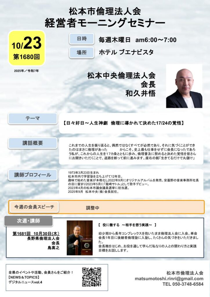 2025年 10/23 木曜日 松本市倫理法人会 モーニングセミナー 参加費: 参加費無料(朝食代:別途1,500円) 6:00〜7:00 (松本市)モーニングセミナー 【日々好日~人生神劇 倫理に導かれて決めた17/24の覚悟】 松本市議会議員 松本中央倫理法人会 会長 和久井悟氏 セミナー参加申込 会場 ホテルブエナビスタ 主催 松本市倫理法人会 https://maps.app.goo.gl/KKFXWNXbyzZKcY9ZA