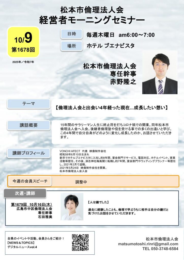 2025年 10/9 木曜日 松本市倫理法人会 モーニングセミナー 参加費: 参加費無料(朝食代:別途1,500円) 6:00〜7:00 (松本市)モーニングセミナー 【倫理法人会と出会い4年経った現在…成長したい想い】 VONCHI AFECT 代表 松本市倫理法人会 専任幹事 赤野隆之氏 セミナー参加申込 会場 ホテルブエナビスタ 主催 松本市倫理法人会 https://maps.app.goo.gl/KKFXWNXbyzZKcY9ZA