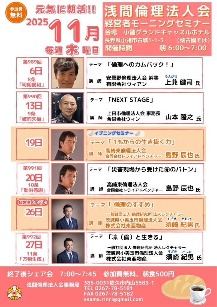2025年 11/30 木曜日 浅間倫理法人会 モーニングセミナー 参加費: 参加費無料:朝食代別途(500円) 6:00~7:00AM (浅間)令和7年11月度 月間予定表 講話内容11月月間予定表講師プロフィール セミナー参加申込 会場 小諸グランドキャッスルホテル 主催 浅間倫理法人会 https://maps.app.goo.gl/C6zRsyWff7hstEF9A