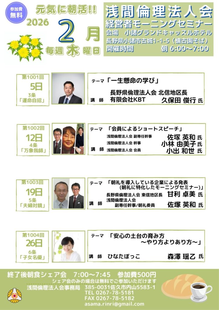 2026年 2/1 月間曜日 月間予定表浅間倫理法人会 モーニングセミナー 参加費: 参加費無料:朝食代別途(500円) 6:00~7:00AM (浅間)令和8年2月度 月間予定表 講話内容令和8年2月月間予定表講師プロフィール セミナー参加申込 会場 小諸グランドキャッスルホテル 主催 浅間倫理法人会 https://maps.app.goo.gl/C6zRsyWff7hstEF9A