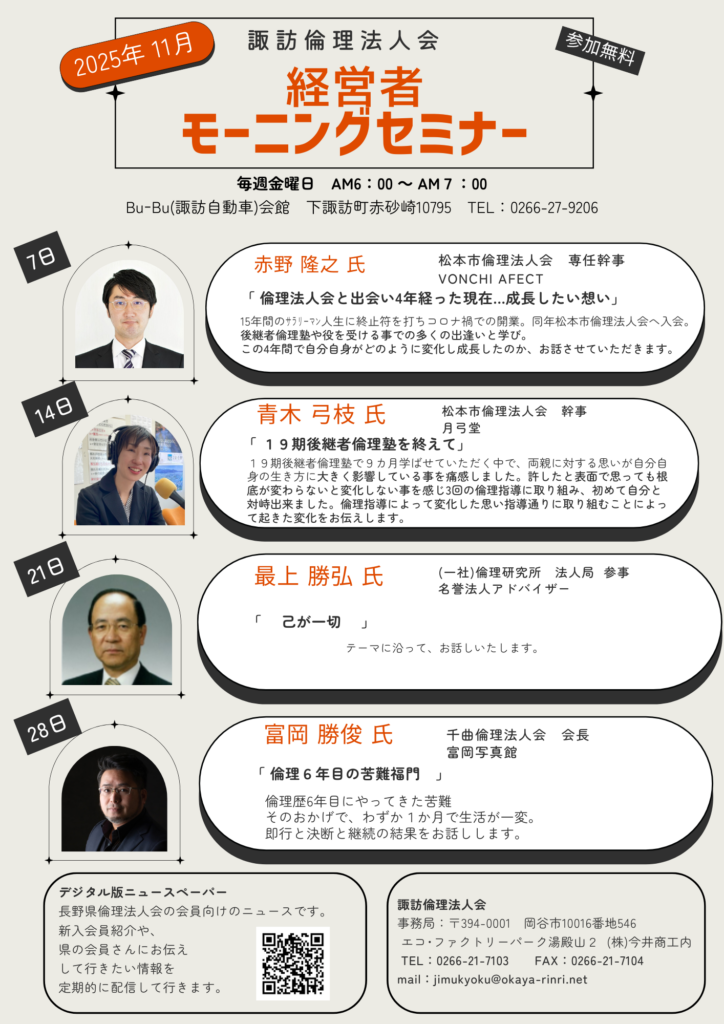 2025年 11/30 金曜日 月間予定表諏訪地区諏訪倫理法人会 モーニングセミナー 参加費: 参加費無料 (朝食代別途300円) 6:00~7:00AM (諏訪)11月モーニングセミナー予定表 セミナー参加申込 会場 諏訪自動車会館Bu-bu 主催 諏訪倫理法人会