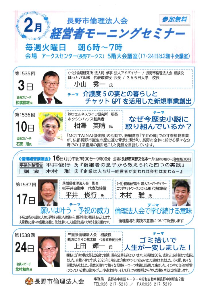2026年 2/1 月間曜日 長野市倫理法人会 モーニングセミナー 参加費: 無料(朝食会場は別途 500円) 6時~7時 (長野市)2月セミナー一覧 会場 アークスセンター5階大会議室 主催 長野市倫理法人会