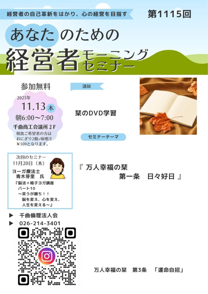 2025年 11/13 木曜日 千曲倫理法人会 モーニングセミナー 参加費: モーニングセミナー無料 6時~7時 朝食:屋代駅前のMaゐCafe(マイカフェ)さんのおにぎりセット¥500 7時~7時半 (千曲)モーニングセミナー 会場 千曲商工会議所 主催 千曲倫理法人会 https://maps.app.goo.gl/immFncfDMc32sAk59
