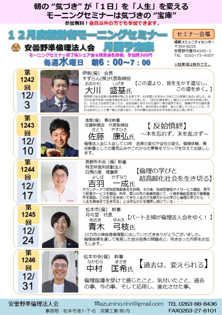 2025年 12/1 水曜日 中信地区安曇野準倫理法人会 モーニングセミナー 参加費: セミナー無料(朝食代300円) 6時~7時 12月安曇野準(倫)モーニングセミナー月間予定 12月安曇野準(倫)モーニングセミナー月間予定 会場 成相コミュニティーセンター 主催 安曇野準倫理法人会