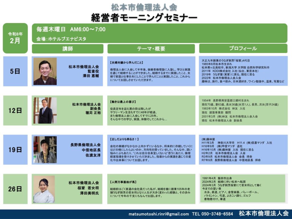 2026年 2/1 木曜日 月間予定表松本市倫理法人会 モーニングセミナー 参加費: 参加費無料(朝食代:別途1,500円) 6:00〜7:00 (松本市)2月5,12,19,26日モーニングセミナー セミナー参加申込 会場 ホテルブエナビスタ 主催 松本市倫理法人会 https://maps.app.goo.gl/KKFXWNXbyzZKcY9ZA